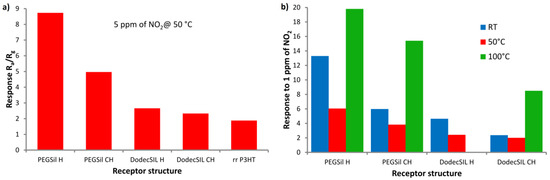 Summary of sensor responses to (a) 5 ppm of NO2 at 50 °C, in reference to rrP3HT response taken from our previous work [18]; (b) 1 ppm of NO2 at different temperatures.