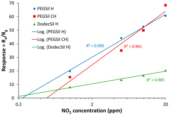 Table 4 presents a comparison of the responses to NO2 of PEGSil H and other P3HT-based receptor materials that were recently investigated in the literature. This summary shows that the graft copolymers investigated in our current and previous work [18] show higher responses to NO2 than clean P3HT and P3HT that are functionalized using other methods. In this case, the responses to 1 ppm of NO2, at all measured temperatures were significantly higher than the responses of the other compared materials’ responses to 4 ppm or 5 ppm of NO2 (Table 4). This confirms that the investigated materials have a greater potential for the measuring of NO2 in sub-ppm and ppb concentration levels than other P3HT-based materials. Thus, we can conclude that our strategy for improving the NO2 sensing properties of CPs, using the grafting method, is a promising advance in the research of tailor-made functionalized receptor materials. The obtained results show that the responses of the proposed graft copolymers are comparable with MOX based sensors and can be considered as an alternative to these sensors for NO2 sensing. The advantages of these materials include a relatively low operating temperature and the numerous technologies available for the application on transducers, (such as spin-coating, printing, drop-coating, and dip-coating methods). However, long-term stability and selectivity of such materials still require further investigation.