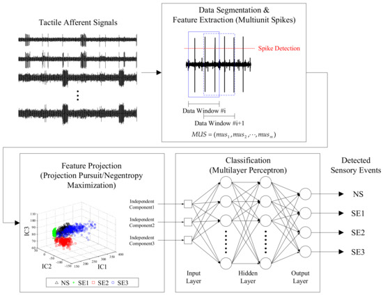 The performance of the proposed method was evaluated with respect to detecting the sensory events from the tactile afferent activities recorded from the L4 dorsal root ganglion using a 16-channel microelectrode. Sensory events were induced by mechanical stimulation of three different areas, each of which is related to a different afferent nerve of the plantar surface of the rat hind paw. The recorded tactile afferent signals were segmented to a 200 mm data window and MUSs were extracted from each data window as a multiunit activity-based feature vector. Feature projection was implemented using PP/NEM and the projected feature was subsequently used as an input for the MLP classifier. Each decision was selected as a sensory event according to the maximum output. The proposed method was conducted using an Intel® Core™ i3-4100M 2.5 GHz PC with 4 GB of RAM.