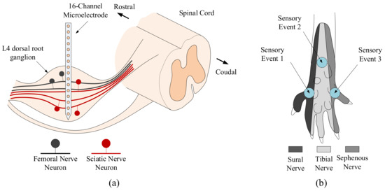 The scheme for tactile afferent signal recording and sensory events. (a) Simplified illustration for the femoral and sciatic nerve neurons distribution of the L4 dorsal root ganglion. Tactile afferent signals were recorded from the L4 dorsal root ganglion using a microelectrode in which the neurons of the femoral and sciatic nerves are shared in the L4 ganglion. (b) Sensory events were generated by mechanical stimulation of three different areas of the rat hind paw in accordance with the cutaneous receptive fields of the three afferent nerves: the sural, tibial, and saphenous nerves.