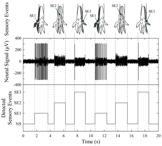 Typical examples of recorded tactile afferent signals during sensory events. The top plot shows three types of sensory events. SE1, SE2, and SE3 represent sensory event 1, sensory event 2, and sensory event 3, respectively. The second plot shows representative neural signals from one channel. Different temporal activities were observed for the different sensory events, and the signals were mixed fast-adapting and slow-adapting afferents. The bottom plot shows the desired output of the proposed sensory event detection method.
