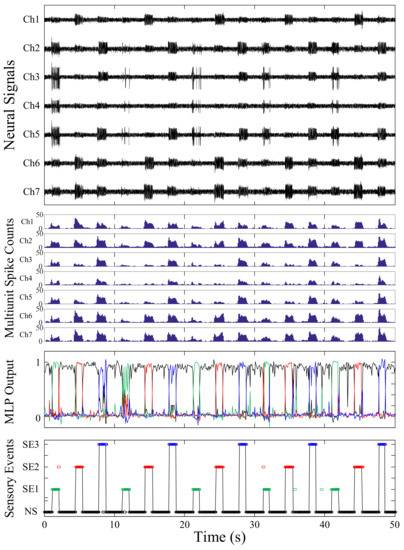 Figure 3 shows a typical example of recorded neural signals from the L4 dorsal root ganglion during mechanical stimulation on the three different areas of the plantar surface of the rat hind paw using a von Frey monofilament. The top plot represents the application of three types of sensory events: SE1, SE2, and SE3. The middle plot is one representative channel of the recorded tactile afferent signal for sensory events. The bottom plot is the desired sensory event detection. The L4 dorsal root ganglion contains neurons of both the sciatic and femoral nerves. These include the sural, tibial, and saphenous afferent fibres which arise from different receptive fields of the rat hind paw and afferent activities are transmitted along the individual fascicles of the sensory neurons. The signal amplitude is associated with the relative distance and orientation between the neurons and the channels of the electrode. Therefore, different spatial patterns of neural activities corresponding to sensory events can be observed in the different electrode channels with each channel having different temporal patterns of neural activities corresponding to sensory events. These patterns of tactile afferent activity are repeatedly elicited by and used to detect sensory events.