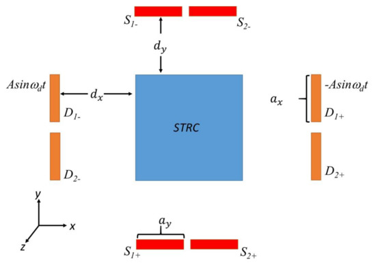 In Figure 1, the x-axis is the direction of drive mode. The y-axis is the direction of sense mode, and the z-axis is the input direction of the angular rate. The blue movable electrode is the structure (STRC) electrode, and it is biased with a DC voltage U0. In terms of drive mode, the four orange plates are exactly the same and fixed. The upper two plates are actuation electrodes D1+ and D1−. Asinωdt and −Asinωdt are differential alternating current (AC) excitation voltages applied to the two electrodes for generating an electrostatic driving force Fx on the movable plate. The lower two plates D2+ and D2− are detection electrodes of drive mode, which detect the drive-axis displacement of the STRC electrode. The same structure exists in sense mode. The plates S1− and S1+ are detection electrodes of the sense mode, which detect the sense-axis displacement of the STRC electrode. The plates S2− and S2+ are force feedback electrodes of sense mode and are used to compensate for the Coriolis force induced by the input angular rate.