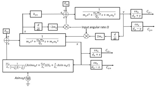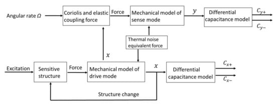 where Qx and ωx are the quality factor and resonant angle frequency of drive mode, respectively, Qy and ωy are the quality factor and resonant angle frequency of sense mode, respectively, and mx and my are the effective drive mass and effective sense mass, respectively. It is noteworthy that the quality factor and resonant frequency of gyroscopes are greatly affected by ambient temperature. The effect of temperature on parameters will be discussed in the following temperature model.