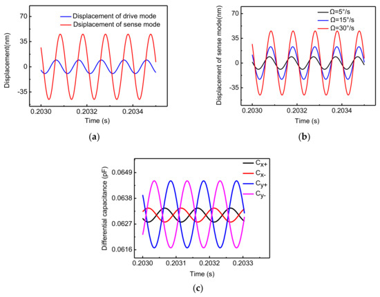 The simulation results of the capacitive micro-gyroscopes PSPICE model are described in Figure 5. Figure 5a shows that the drive-axis displacement and sense-axis displacement are stable sine waves with the same frequency as the AC excitation voltage. This means that the Coriolis Effect has been achieved through the established PSPICE model. Figure 5b indicates that the amplitude of the sense-axis displacement changes with the angular rate. It is noteworthy that the sense-axis displacements corresponding to different angular rates will intersect at specific points. At these points, the phases of the sense-axis displacement are some periodic values, which will cause the sense-axis displacement to be zero and the quadrature displacement to be the maximum. Therefore, these points represent the quadrature displacement, which is induced by an elastic coupling force and its amplitude is 4.804 nm. The sense-axis displacement is not proportional to the angular rate input due to the existence of quadrature displacement. Figure 5c shows that the displacements of gyroscopes can be converted into differential capacitance changes. Thus, all output ports of this PSPICE model are capacitance interfaces that can be connected directly to a C-V conversion circuit.