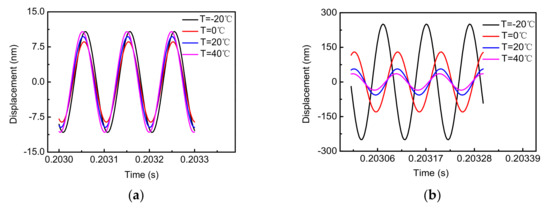 Changes in ambient temperature will cause changes in the resonant frequencies and quality factors of MEMS gyroscopes, which can affect the dynamic characteristics of the gyroscope. Therefore, the same excitation voltage will induce different drive-axis displacement and sense-axis displacement at different ambient temperatures. Figure 6 shows the corresponding simulation results.