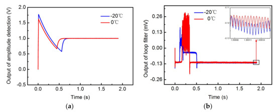 The closed-loop simulation results of drive mode: (a) the output voltage of amplitude detection at different temperatures (b) the output voltage of the loop filter at different temperatures.