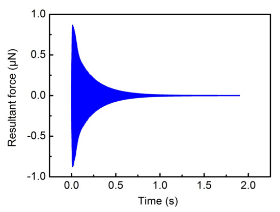 For sense mode, the closed-loop detection is based on complete compensation for the Coriolis force. This means that the proof mass is only affected by the quadrature force, which causes the proof mass to always vibrate near the equilibrium position. The closed-loop detection method uses the Proportion-Integration (PI) controller algorithm, which will be specifically explained in Section 3.2.3. Figure 8 shows the simulation result of the resultant force of Coriolis force and feedback force.