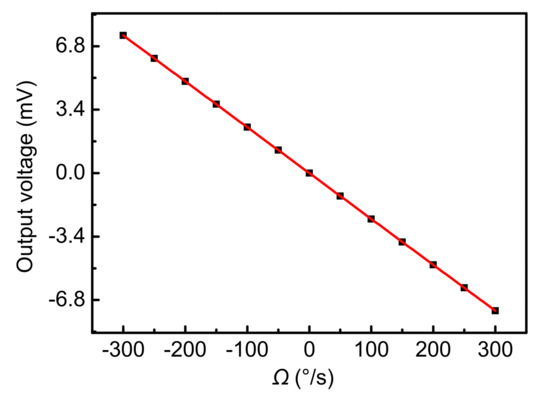 Different input angular rates can cause different Coriolis force values, so the feedback force induced by the output voltage also changes. Therefore, there is a proportional relationship between the input angular rate and the output voltage. Figure 9 shows that the scale factor is –0.02459 mV/(°/s) with a linear correlation coefficient of 1. The nonlinearity induced by the parallel-plate sensing mechanism is completely eliminated in closed-loop detection because the proof mass always vibrates near the equilibrium position.