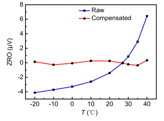 where is the curve fitting results for T, and its unit is μV. The final compensated curve is the difference between the raw simulation result and the fitting result. The final temperature result shows that the compensated ZRO voltages are around zero in the temperature range from −20 to 40 °C.