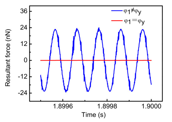 The simulation results show that when , the resultant force of Coriolis force and feedback force is not equal to zero. Therefore, the Coriolis force has not been completely compensated for in this case. The above analysis and simulation show that the optimization of Coriolis force compensation is achieved by choosing a suitable demodulation signal phase .