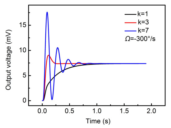 In addition to the phase of the demodulation signal, the circuit gain of closed-loop detection will also affect the performance of the circuit. For simplicity, we take the product of and as k for analysis. Figure 13 shows different stabilization times at different k.