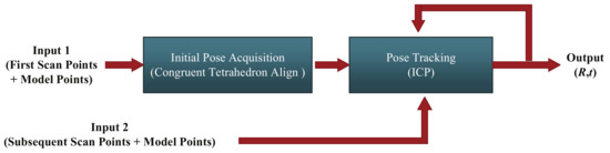 In general, more than one corresponding tetrahedron can be found in the hash table, but only one is correct. In order to deal with this case and choose the correct one, a strategy is used to detect the failure of the CTA algorithm autonomously. The logic of the approach is shown in Figure 5. When a corresponding tetrahedron is found, the relative transformation is calculated as described in Section 3.1.3 and the transformation is applied to the whole scanning point cloud. After that, the ICP algorithm is used to refine the registration result. The accuracy measurement of the algorithm is ICP convergence score , the value of the closest point to the Euclidean distance which is calculated by Equation (5). Moreover, two threshold values and are set up. If , the registration is believed to be correct, then it is used as the input parameters of the pose tracking stage. Otherwise, if & , it is saved as a candidate, until all of the candidates are looked up in the hash table. After that, choose the transformation corresponding to the smallest as the output of the CTA for the input of the pose tracking.