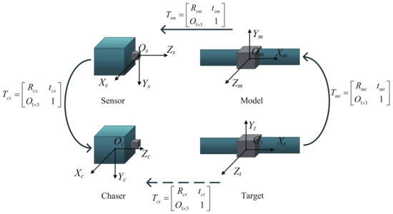 denotes the transformation (including rotation and translation) from frame j to frame i. Generally, can be measured offline, depending on the assembly relation of chaser and sensor. can be obtained from the definition of model frame. , the rotation and translation from target to chaser, can be calculated by Equation (1), where due to the achievable knowledge of and , we only need to calculate .