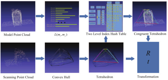 Essentially, the relative pose determination, or registration, consists of finding the overlap between the model point cloud and the scan point cloud, and then calculating the relative transformation. Instead of extracting features, our method finds the congruent tetrahedron directly from the scanning point cloud and model point cloud, and then estimates the relative pose by aligning the congruent tetrahedron. The procedure of the algorithm is illustrated in Figure 3. The model point cloud is sampled from the known 3D CAD model of target. Let be the length of point pairs in the model point cloud. In order to search the corresponding point quickly and accurately, a two-level index hash table which has a low-time complexity of looking up is designed for storing the point pair length as well as the location topology information. When the scanning point cloud is obtained, a 3D convex hull will be constructed to simplify it. Then a tetrahedron with the largest volume is found in the vertices of the convex hull. According to the congruence theorem for tetrahedra, the corresponding tetrahedron of is found in the model point cloud, and then the transformation between them will be calculated.