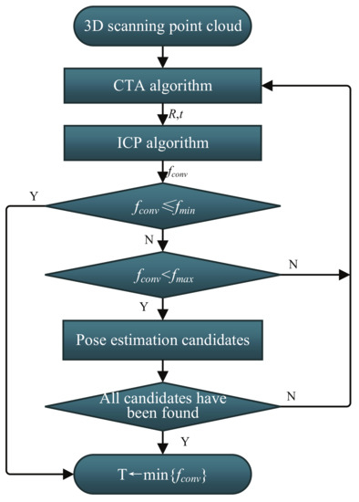 The logical scheme of the process to determine relative pose of uncooperative target is shown in Figure 1. The process is divided into two main steps, named initial pose acquisition and pose tracking, respectively. The proposed CTA algorithm is applied in the initial pose acquisition process when the first scan point cloud is obtained from the scanning LIDAR. The model point cloud can be obtained from the 3D CAD model, which is known. Pose tracking is performed by means of ICP algorithm, which requires a good initial pose estimate. The details of the proposed method are described in the following parts of this section.