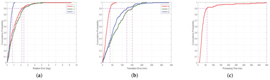 Performance of congruent tetrahedron align algorithm. (a) CDF of rotation error; (b) CDF of translation error; (c) CDF of processing time.