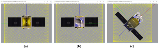 In test 2, the initial attitude is set to , as shown in Figure 10a, and the target rotates around the model’s Z-axis (axis perpendicular to the solar array of the model and perpendicular to the screen). For each simulated point cloud, the is changing from to at interval;