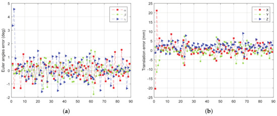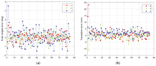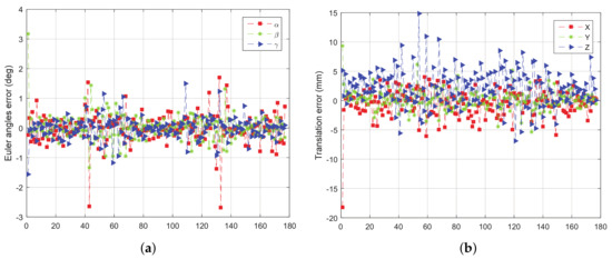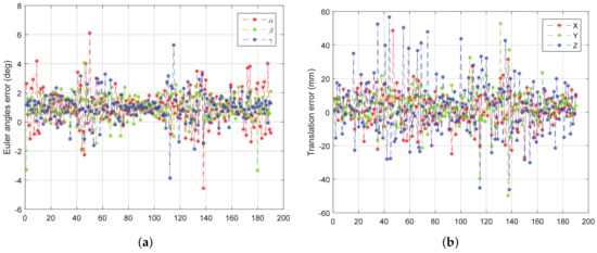 From Figure 11, Figure 12, Figure 13 and Figure 14, we can see that, the rotation error is almost less than , and the translation error is almost less than 10 mm in different initial attitudes and different rotation axes. This indicates that the CTA computing initial position proposed in this paper, and pose tracking by ICP algorithm is accurate, fast and robust. However, there also exist some outliers which can be divided into two groups. One of the groups appears in the first few frames, which is due to the large error of the initial pose estimation. The other group appears in the frames, e.g., frame 43 and 133 in Figure 11a, in which the LIDAR can only scan a small part of the target. Under this condition, the feature of the scanning point cloud is not obvious. At the same time, the standard ICP algorithm tends to fall into a local optimal solution, leading to an increase in the error.