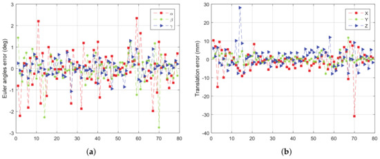 From Figure 16, we can see that both the rotation error and the translation error of the field experiment are increased compared with the results of simulation experiments. The reason is that the measurement error of LIDAR itself is more complicated than the simulation error, and the rotation of the target also leads to the deformation of the point cloud data. However, the overall result still shows good accuracy and stability; the rotation error is almost less than , and the translation error is almost less than 20 mm.