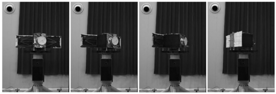In order to test the real performance of the algorithm, a field experiment was carried out. The satellite model with a 1:6 scale, shown in Figure 15, was fixed on a 6-DOF turntable, and the model can follow the turntable to make a rotary motion about the fixed axis. The control precision of the turntable is .