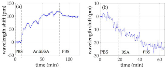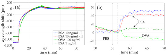 Comparison of the wavelength shift evolution of all the experiments: (a) antiBSA immobilization; and (b) target analyte detection.