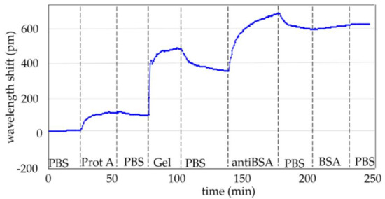 The second test was carried out by following the experimental procedure described in Section 2.2 until the BSA detection step. The aim of this experiment is to test the protein A layer creation and its effect over the immobilization of the antibodies. In Table 1, the flow times of the reagents are reported. In Figure 6, the wavelength shift time evolution is shown, where the creation of each layer (i.e., protein A, gelatin blocking, antiBSA and BSA) can be clearly appreciated. In this measurement, after the immobilization of the protein A, a wavelength shift of 110 pm was observed whereas, for the gelatin blocking step, the shift was around 270 pm. This means that the sensor surface was not fully covered by the protein A and the intermediate layer had defects. After flowing gelatin (Gel in Figure 6), during the PBS washing, a strong and constant negative drift can be appreciated. The drift represents the desorption of the gelatin. Next, a shift of about 220 pm was measured after the antiBSA immobilization. At the end, we flowed the target BSA with a concentration of 100 ng/mL in order to carry out the detection. The wavelength shift due to BSA was around 40 pm.