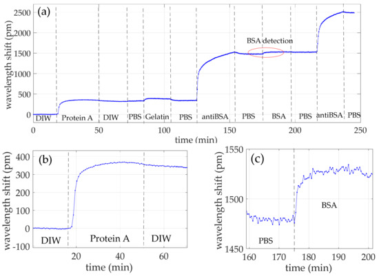 The first experiment was carried out by following the whole experimental procedure described in Section 2.2. However, DIW was used now as buffer for the protein A instead of PBS, in order to avoid the adsorption limitation previously described and to enhance the coverage of the sensor surface. By using DIW as a buffer, whose pH is 5–5.5, protein A is electrically neutral and its adsorption on the sensor surface can occur without charge-related limitations. Then, before running the gelatin blocking step, the buffer is changed from DIW to PBS. In Table 2, the flow times of the reagents are reported. In Figure 7a, the wavelength shift evolution of the experiment is shown. As shown in Figure 7b, the immobilization of protein A produced a wavelength shift of about 340 pm. Then, the gelatin blocking step caused a shift of only 5 pm, thus indicating that the protein A layer was properly created in the previous step. Next, a shift of around 1100 pm was measured for the antiBSA immobilization, five times higher than for the antiBSA immobilization step from the previous experiment. This result was due to the presence of the closely-packed protein A layer and confirms its effectiveness. At the end, the target BSA was flowed with a concentration of 10 ng/mL. A wavelength shift of around 50 pm was measured due to the recognition of the BSA, as shown in Figure 7c. In order to confirm such detection, the sandwich format was employed by flowing a second cycle of antiBSA. A wavelength shift around 950 pm was then measured, almost the same value as the first antiBSA flow, which indicated that almost all the BSA bound to the first antiBSA layer (capture antibody) was recognized by the second antiBSA flow (detection antibody).