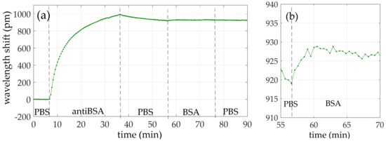 After the glycine regeneration process, a second biosensing experiment was carried out starting directly with the immobilization of the recognition antiBSA antibody. In Table 3, the flow times of the reagents are reported In Figure 8a, the wavelength shift evolution is shown. A wavelength shift due to the creation of the antiBSA layer of 1120 pm was observed. Then, BSA of 10 ng/mL detection produced a shift of about 45 pm, as shown in Figure 8b. Finally, the sandwich format caused a wavelength shift of around 800 pm. Such results are almost the same of those obtained in the previous experiment.