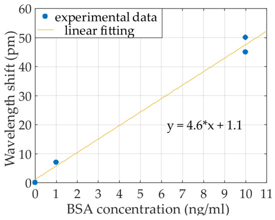 Once the BSA detection was confirmed and the specificity of this approach was demonstrated with the previous experiments, additional experiments were carried out in order to determine the limit of detection of our sensor. In Table 5, the flow times of the reagents are reported. The lowest BSA concentration that we were able to detect was 1 ng/mL, which produced a wavelength shift of around 7 pm, as shown in Figure 10.
