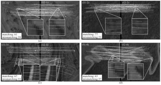 The results of the experiment using MATLAB software (R2014a version) are displayed in Figure 11. As seen in Figure 11a,b when the image pairs are covered with bare soil and trees, the numbers of correctly point pairs are 61 and 77; Figure 11c,d when the image pairs are covered with traffic lines, such as expressways and rural roads, the numbers of correctly point pairs are 67 and 63; Figure 11e,f when the image pairs are covered with buildings, such as bungalows and high-rise buildings, the numbers of correctly point pairs rise to 80 and 85. The results indicate that the matching rate is impacted by the textures, especially when the image is covered with buildings, a high matching rate is achieved. A further analysis of the matching performance is depicted in next section.