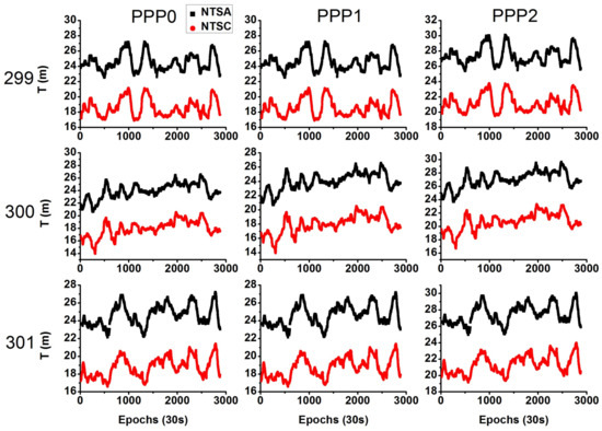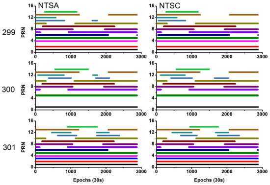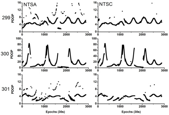 Figure 1 shows the observed and useable BDS satellites for the two stations during the experimental period. The average number of visible satellites was (9, 9), (6.5, 6.5), and (9, 9) for the NTSA and NTSC stations on the three days, respectively. In addition, Figure 2 shows the position dilution of precision (PDOP) values for these stations. The average PDOP values were (5.23, 5.03), (17.89, 17.78), and (3.59, 3.58) for the NTSA and NTSC stations on these three days, respectively. On day 300, some of the observed satellites were deleted as their orbit and clock products had low precision, thereby resulting in fewer useable satellites and larger PDOP values on this day.