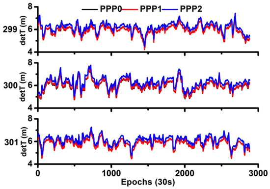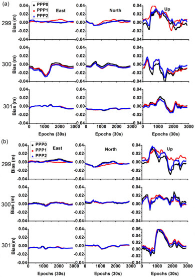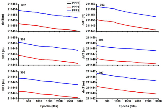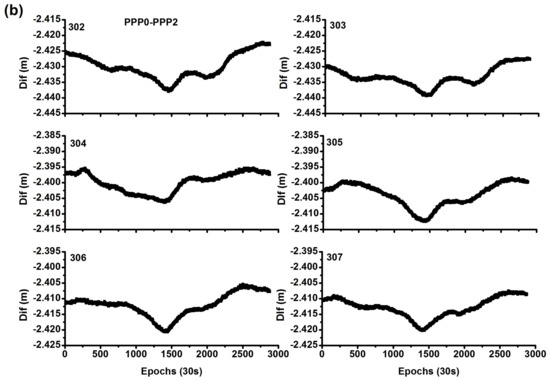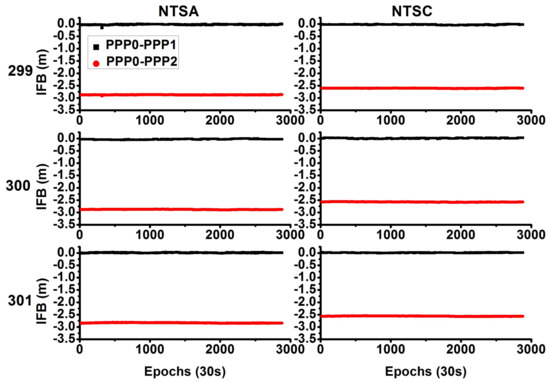 Figure 6 shows the system biases; they are very stable for different days. In general, the system bias between PPP0 and PPP1 should be zero, as the PPP1 model estimates the IFB. As Figure 6 shows, for the PPP0 and PPP1 models, the bias of the time difference is considerably small, with mean values of (0.0025, −0.0005, −0.0010) m and STD of (0.019, 0.015, 0.011) m for these three days. For the PPP2 model, as the IFBs are absorbed by the receiver clock, the bias represents the difference of the hardware delay between different stations and different frequencies. As Figure 6 shows, for the PPP0 and PPP2 models, the bias of the time difference is very large, with mean values of (−0.2673, −0.2638, −0.2718) m and STD of (0.006, 0.005, 0.004) m for these three days. As Table 1 shows, the PPP2 model has the smallest noise compared to the PPP0 and PPP1 models; thus, the STD of the PPP2 model is also much smaller than that of the PPP1 model.