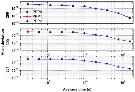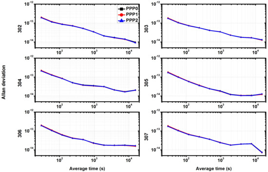 Figure 7 shows the Allan deviation values at different time intervals of the three models for precise time transfer, which is used to compare the performance of the three schemes, especially for the case of short term. The value of Allan Deviation is determined by one day data which contains 2880 data points and over a span of 86,400 s. As seen in this figure, the frequency stability is the same for the three different models. In addition, as the receivers are connected to a common external time frequency from the NTSC laboratory, for the three continuous days, the Allan deviation also has the same variation, and the stability of 10,000 s is better than 5 × 10−13.