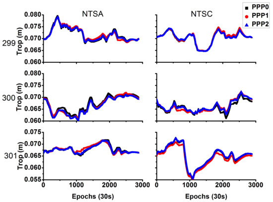 For these time transfer models, the residual tropospheric delay is estimated as a piecewise constant every hour. Figure 9 shows the time series of the estimated residual tropospheric delay. The three different models did not show a significant difference in the estimated tropospheric delays, with maximal difference of ~1 mm.