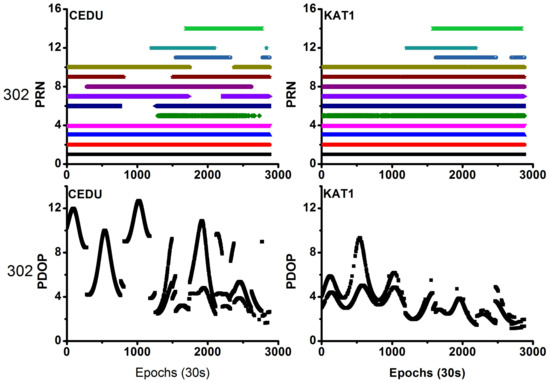 PRN and position dilution of precision (PDOP) values on day 302 (left side represents CEDU station, and the right side represents KAT1 station).