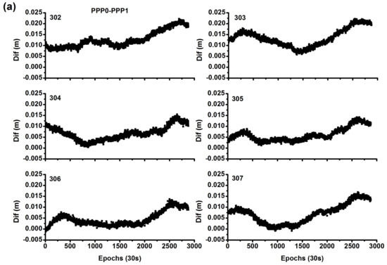 Figure 12 shows the system biases; they are very stable for different days. As Figure 12 shows, for the PPP0 and PPP1 models, the bias of the time difference is considerably small, with mean values of (0.012, 0.013 0.007, 0.007, 0.005, 0.007) m and STD of (0.004, 0.004, 0.003, 0.003, 0.003, 0.004) m for these six days. And for the PPP0 and PPP2 models, the bias of the time difference is very large, with mean values of (−2.430, −2.433, −2.400, −2.403, −2.412, −2.413) m and STD of (0.004, 0.003, 0.003, 0.004, 0.004, 0.003) m for these six days.