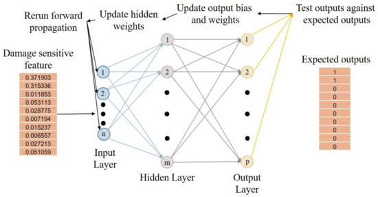 The activation function used in neural networks can take many forms, including linear, sigmoid, and softmax functions [23]. This work uses the sigmoid activation function for the hidden and output layers because of its speed towards a classification value of one in binary classification compared with the linear and softmax functions. This work uses the sigmoid activation function for the hidden and output layers because it is computationally efficient during training step due to it being monotonic. It provides probabilistic interpretation of the output, especially for binary classification such as the damaged and intact states in this study. The softmax function is better suited for multiclass classification because of the summation of probabilities to 1. The sigmoid activation function is used to find the output of each neuron in each layer shown in general by Equation (3):