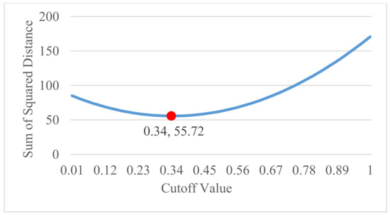 The cutoff value used is key to determining what information will be used to denote intact and damaged locations. The cutoff value has been automated based on the minimum squared distance from the cutoff value to the EIF values determined using the wavelet transforms. This alleviates the need for a user-defined cutoff value, but is predicated on the ability to separate the EIF values better than those first found by the wavelet transforms. The ANN fosters this by definition and filters the EIFs towards 0 (intact) and 1 (damaged) poles. Figure 3 shows the squared distance of potential Cutoff Values (CVs) of 0.01 to 1, increasing by 0.01 at every increment. Because the EIF range falls between 0 and 1, the cutoff value is tested in this range to create two groups, one damaged, and one intact. The value of the cutoff value once the ANN has been applied is not crucial because of the polarization of the data. Many cutoff values would provide the same damage detection. Automation of its selection is however valuable to remove the need for user interaction at this step in the analysis and the least-square method insures that the selection is optimal in determining the damaged and intact classes. Equation (10) gives the equation for the squared distance calculation.