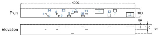 To validate the damage detection method, two reinforced concrete beams were tested; the first one is a simple concrete beam with artificially simulated damage with dimensions of 300 × 360 × 4000 mm, and the second one is deteriorated concrete beam in a parkade (a multistorey car park) in the city of Winnipeg. For the first beam, double-layered plastic and foam were imbedded in the concrete to simulate delaminations and voids, respectively. Delaminations and voids can provide locations for water to accumulate and cause corrosion of reinforcement. Information about delamination and void locations can therefore be important for maintenance decisions and safety of the public, if the deterioration is not addressed. The damage types and layout are seen in Figure 4 and Table 1.