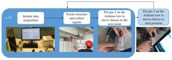 A semi-automated sensor chassis and ANN for structural damage detection is proposed to detect internal damage of large-scale concrete structures. The schematic view of the framework is presented as shown in Figure 1. For semi-automated testing, the air-coupled impact echo method is modified to include a framework of testing devices using an Arduino circuit for automatic movement of the sensor chassis with microphones. The air-coupled impact-echo method utilizes longitudinal waves from the excitation of the structure to determine the internal state. The structure is excited using a 15.8 mm steel ball attached to a steel rod. The use of air as the coupling medium for the sensors and structure has the advantages of being easy to implement and resistant to effects from surface conditions. The drawbacks of using air as the coupling medium are that it has high impedance and limits the types of waves that can be used for investigating the structure, as not all of waves created in contact excitation readily propagate from concrete to air. Damage detection using the air-coupled impact-echo method is outlined in Figure 1.