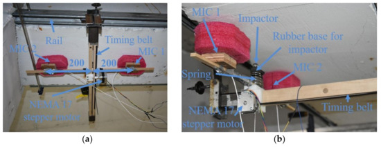 As a second example for a large-scale application to a real concrete structure, the experimental setup is adjusted for the orientation of the structure in the parking garage. Two rails were used to hang the sensor chassis on to avoid the need to hold the microphones and impactor overhead and to guide the chassis. A roller support was used on the opposite side of the rail to prevent vibration upon impact of the beam from the spring-mounted ball bearing. The nominal beam dimensions in the parking garage are 356 × 561 × 17,000 mm. However, testing is limited to a 2.8 m area around the visibly damaged area on the beam. The microphones were placed 2 cm from the surface of the concrete and 200 mm from the source of excitation on either side. The beam was tested at seven rows across the short direction of the beam. Each row was tested 11 times at increments of 30 mm, starting 30 mm from the edge of the beam. Foam was used to dampen the ambient noise and the isolate surface waves from the excitation as much as possible. The sensor setup is visible in Figure 7.