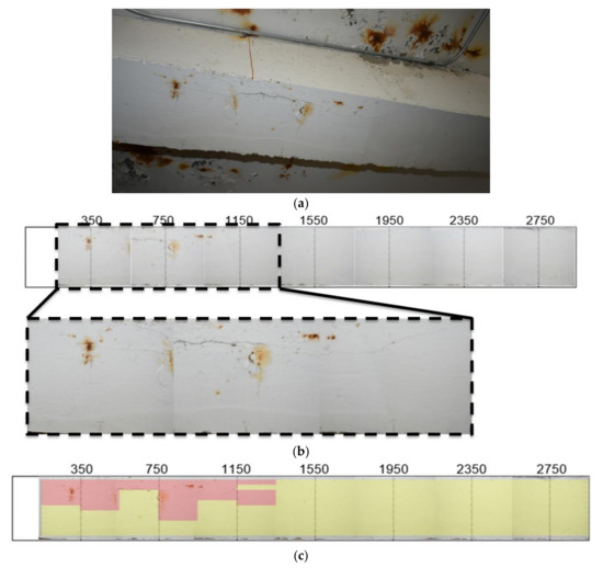 Condition of beam: (a) comprehensive view; (b) compilation of test area images for analysis; and (c) expected results from analysis.