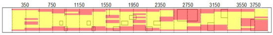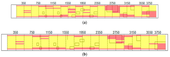 Figure 9a shows the results of damage detection with the use of the ANN in conjunction with the cutoff value calculation. Figure 9b shows the results with the use of the cutoff value calculation only. The damaged locations are indicated in red, and the intact sections are indicated in yellow.