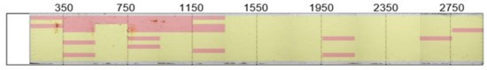 Figure 8b is a compilation of images taken at each of the test rows. The magnified region includes the expected damage in the upper portion of the image. The damage is generally outlined by the cracking in the concrete. The figure is used to underlie the images computed using the acoustic signals. The dashed lines in Figure 8 align with the measurements, correspond to impact sites, and otherwise correspond to microphone measurement locations. Impacts and measurements are carried out every 30 mm in the short dimension of the beam, with a spacing of 200 mm from the impact for both MIC 1 and MIC 2. Figure 7c is the expected result based on preliminary sounding and visual inspection, with the red representing the damaged region and the yellow the intact region.