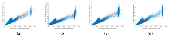 . As in the Poisson noise analysis, the values of the noise parameters for each scale level are different, but the trends of noise distributions are all the same; therefore, it is plotted for only one scale level. In the figure, the variance of the noisy detail layers follows a linear relationship with the pixel intensity of the low-band of the noiseless image. The Poisson–Gaussian noise in the NSP domain can be expressed as