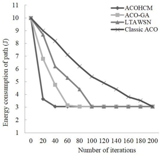 We conduct experiments that compare the convergence speed of the several algorithms including the classic ACO, LTAWSN, ACO-GA and ACOHCM. These four algorithms are run 100 times separately and Figure 2 reports the average number of iterations of each algorithm. In Figure 2, it is clearly to show that ACOHCM algorithm finds the optimal solution after 38 iterations on average, while classic ACO needs 198 iterations on average, 102 for LTAWSN, and 64 for ACO-GA. Therefore, it proves that ACOHCM algorithm is superior to the other three algorithms in terms of the convergence speed.