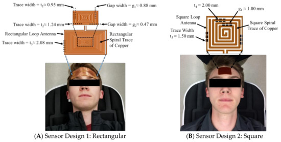 The electromagnetic resonant sensor patch was designed and built from a single baseline component: a trace of copper which was configured into a rectangular planar spiral (Figure 1A). Two separate designs were utilized in this study. The rectangular spiral patch (11.83 cm × 5.92 cm) had 20 turns, a trace width (t1, along the minor axis) of 0.95 mm and a gap width (g1, along the minor axis) of 0.88 mm, and a trace width (t2, along the major axis) of approximately 1.24 mm and a gap width (g2, along the major axis) of 0.47 mm. To address the large size and bulky form factor of the first sensor’s design, a second patch was designed as a square planar spiral (Figure 1B) to reduce surface area, increase ease of adherence to the forehead, and possess a more wearable form factor for human testing. This square sensor design (2.8 cm × 2.8 cm) had 5 turns, a trace width (t4) of 2.00 mm and a gap width (g4) of 1.00 mm.