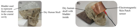 (A) A dry human skull and bladder filled with water were used to represent fluid volume changes in the cranial cavity; (B) The sensor was placed on the outside of the skull and a syringe with tube was used to incrementally simulate a fluid volume shift in the cranium.