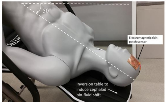 (Live human subjects were used—the mannequin provides visual representation only). The electromagnetic skin patch sensor to detect bio-fluid shift in 50° head down tilt. The mannequin was used to represent system set-up and sensor placement; however, data was collected from human participants.
